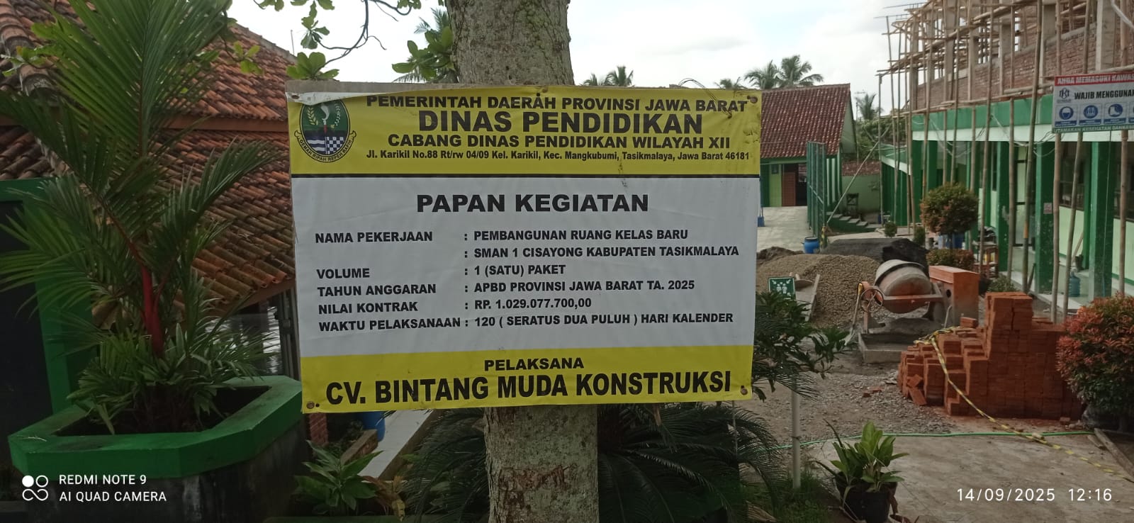 Kabupaten Tasikmalaya, analisaglobal.com – Proyek pembangunan empat ruang kelas baru (RKB) di SMA Negeri 1 Cisayong, yang bersumber dari anggaran APBD Provinsi Jawa Barat tahun 2025 senilai Rp1.029.077.700 dan dikerjakan CV Bintang Muda Konstruksi dengan masa pelaksanaan 120 hari kerja, menuai keluhan dari pihak komite sekolah selaku penerima manfaat.