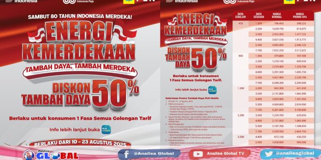 Kota Tasikmalaya, analisaglobal.com — Dalam rangka memperingati Hari Ulang Tahun ke-80 Kemerdekaan Republik Indonesia, PLN Unit Pelaksana Pelayanan Pelanggan Tasikmalaya menghadirkan program spesial “Energi Kemerdekaan – Tambah Daya Tambah Merdeka – Diskon Tambah Daya 50%” bagi konsumen 1 Fasa semua Golongan Tarif. Promo ini memberikan kesempatan kepada masyarakat untuk meningkatkan daya listrik dengan biaya yang lebih hemat.