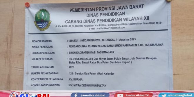 Kabupaten Tasikmalaya, analisaglobal.com – Proyek pembangunan Ruang Kelas Baru (RKB) di SMK Negeri Kadipaten, Kecamatan Kadipaten, Kabupaten Tasikmalaya, menuai sorotan publik. Pekerjaan dengan nilai kontrak Rp 2.064.118.429,00 yang dikerjakan oleh CV Kurnia dengan pengawasan CV Mitra Design Konsultan tersebut diduga mengabaikan Undang-Undang Nomor 14 Tahun 2008 tentang Keterbukaan Informasi Publik.